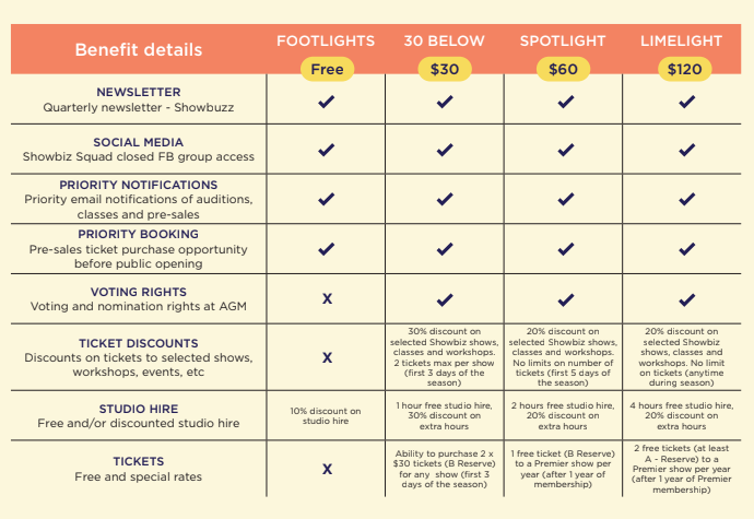 Membership of Showbiz gives you the opportunity to join and support an organisation that makes a significant contribution to the performing arts in Christchurch and to gain numerous benefits.