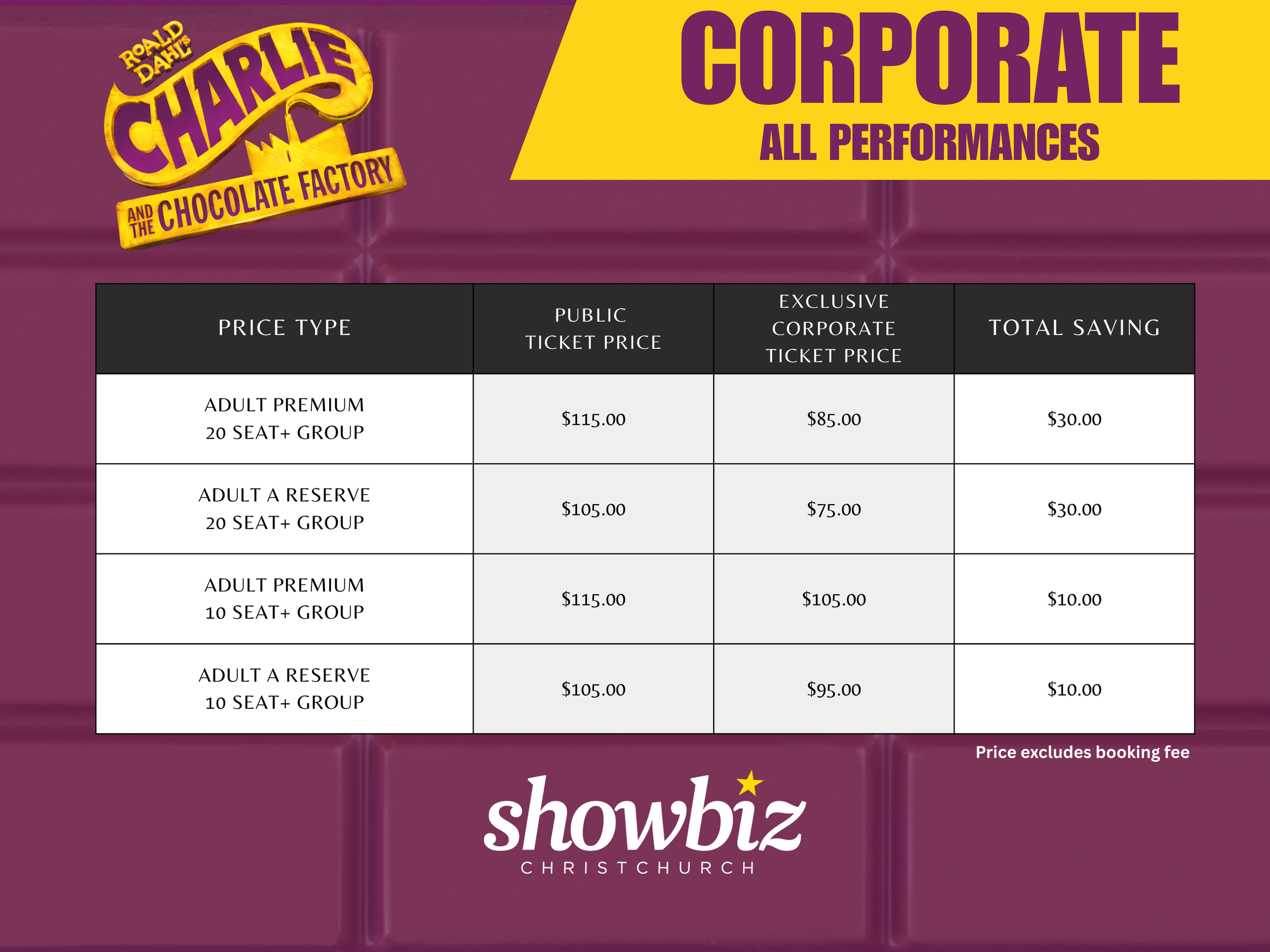 Showbiz Christchurch invites corporate groups to experience the New Zealand premiere of Roald Dahl’s Charlie and the Chocolate Factory at the Isaac Theatre Royal.