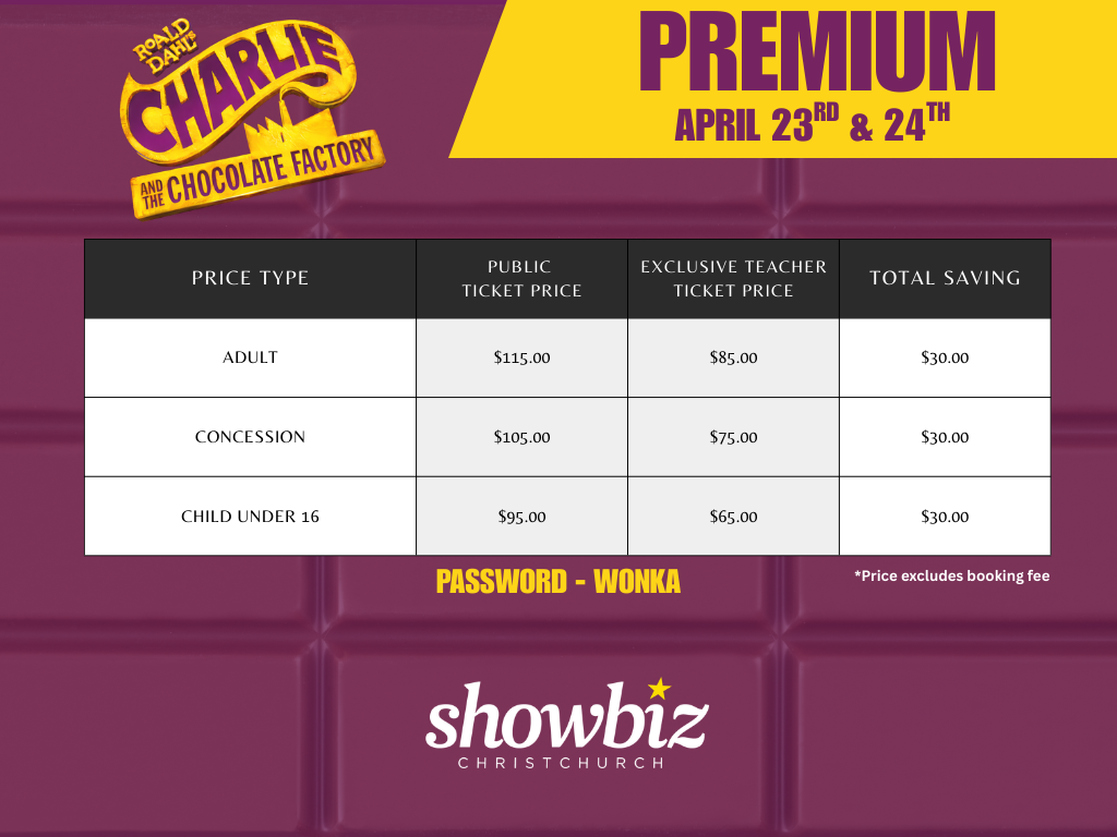As a thank you to teachers across our region, Showbiz Christchurch is delighted to offer an exclusive ticket opportunity for the New Zealand premiere of Roald Dahl’s Charlie and the Chocolate Factory at the Isaac Theatre Royal.